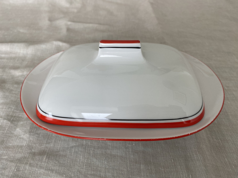 Dit servies van Mitterteich stamt uit de jaren zestig of zeventig en is dus echt retro! Het servies heeft een simpele roodzwarte rand en een vlakkenvorm.