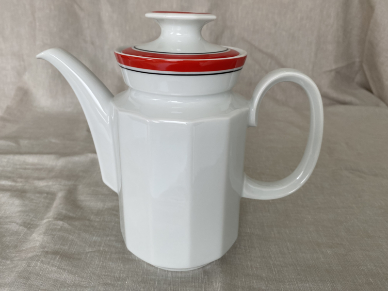 Dit servies van Mitterteich stamt uit de jaren zestig of zeventig en is dus echt retro! Het servies heeft een simpele roodzwarte rand en een vlakkenvorm.