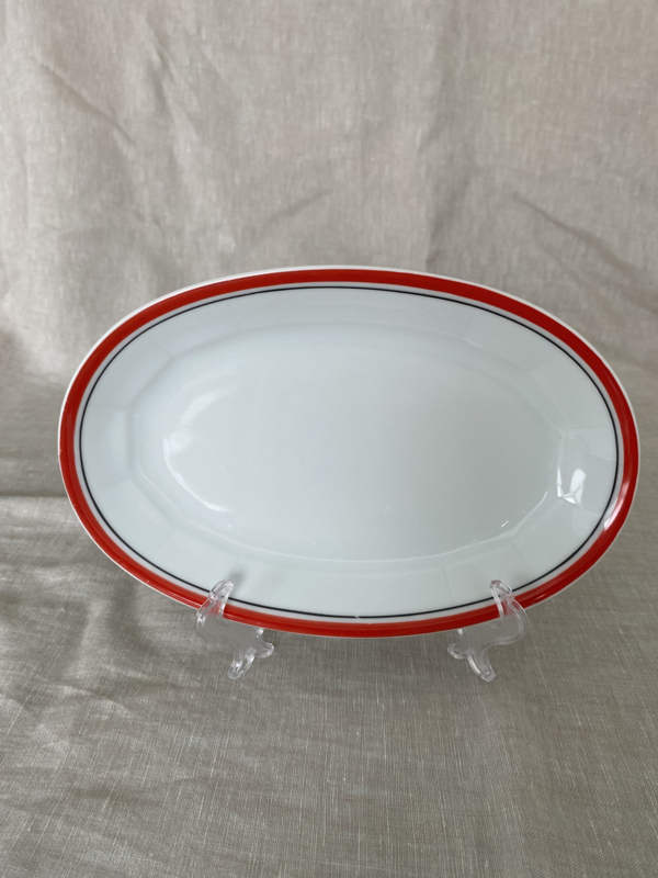 Dit servies van Mitterteich stamt uit de jaren zestig of zeventig en is dus echt retro! Het servies heeft een simpele roodzwarte rand en een vlakkenvorm.